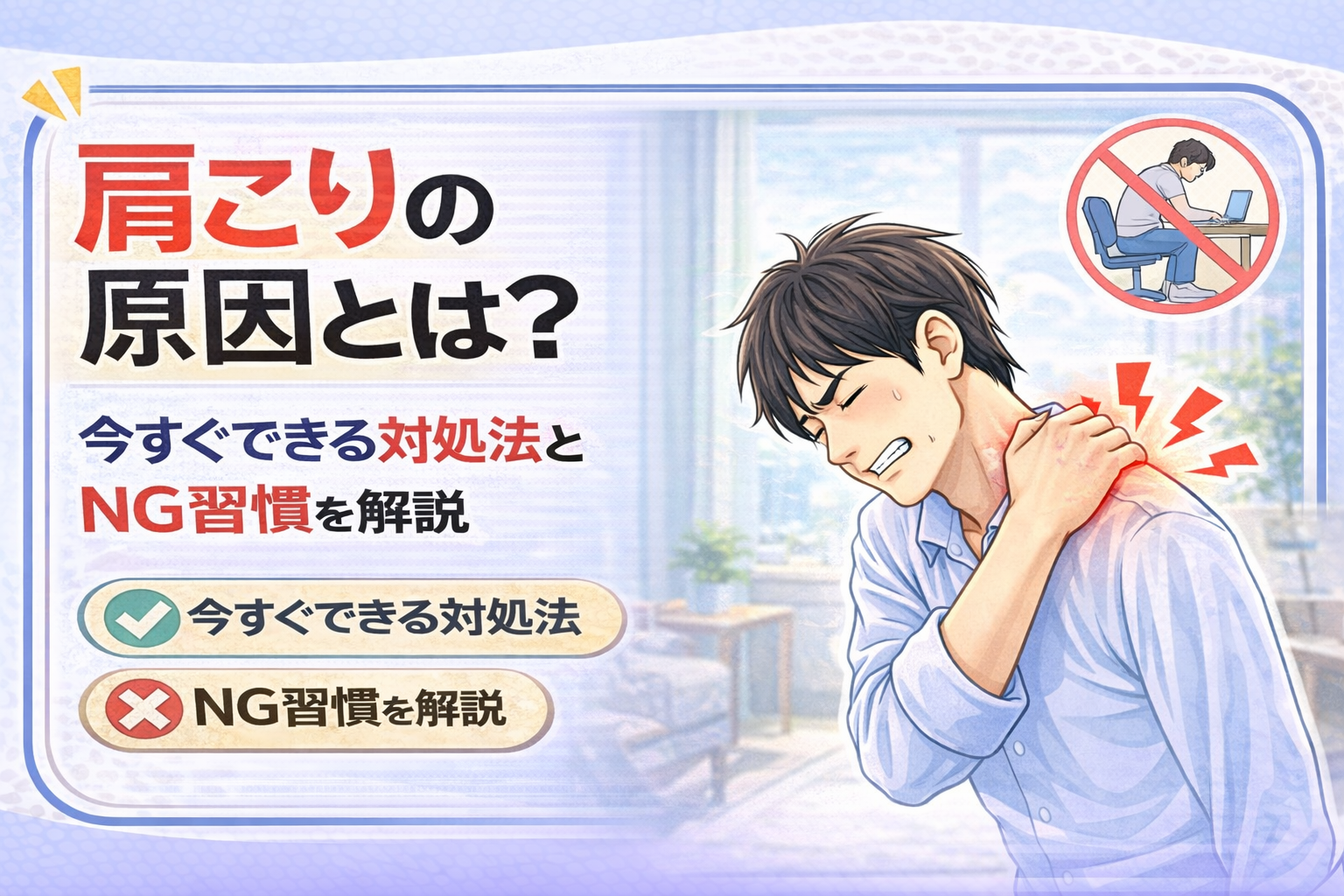 ・肩がガチガチで重だるい→ 肩こりの記事